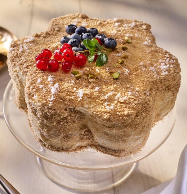 Тонкі, ніжні вафельні листи чергуються з ніжною кремовою начинкою, створюючи багатошарову структуру. Начинка додає м'який смаковий контраст і прекрасно поєднується з хрусткими вафлями.