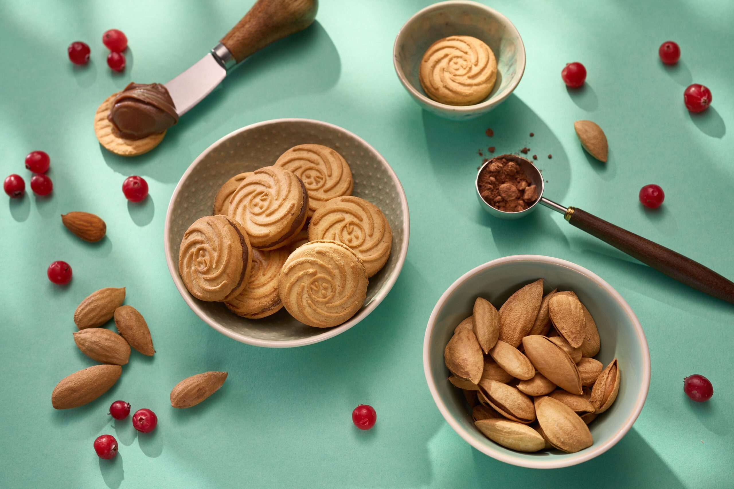 Дві половинки хрусткого печива поєднуються кремовою начинкою, створюючи ніжний смак. Крем надає приємної солодкості та доповнює хрустку текстуру ніжністю всередині.