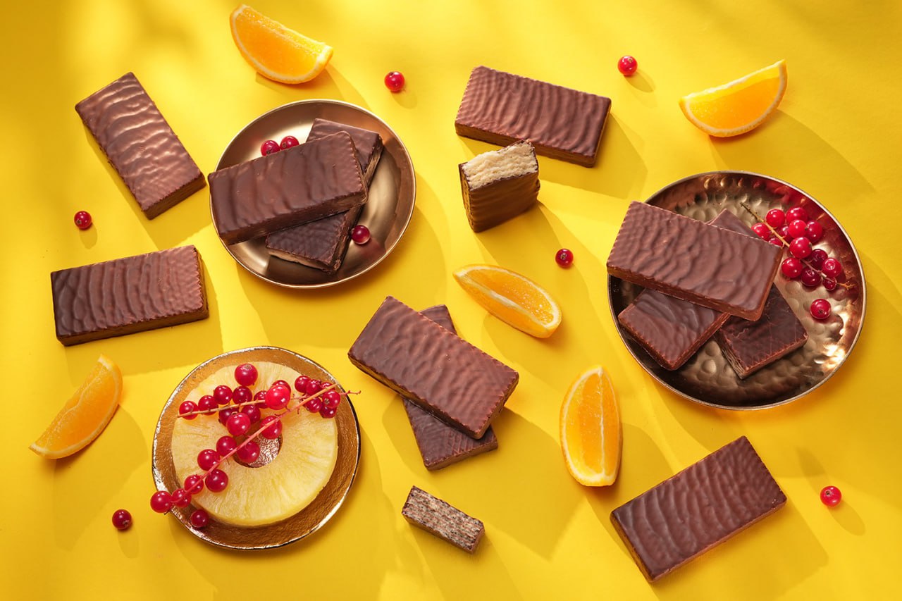 Багатошарові вафлі з кремовою начинкою покривають ароматною глазур'ю, що підкреслює текстуру, роблячи цю улюблену класичну вафельну цукерку особливо смачною та вишуканою.