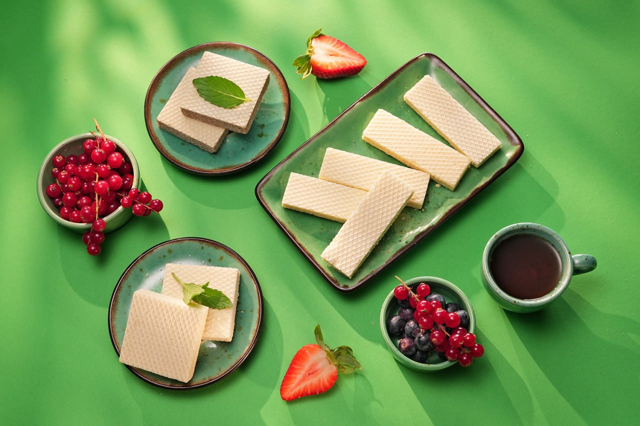 Тонкі, ніжні вафельні листи чергуються з ніжною кремовою начинкою, створюючи багатошарову структуру. Начинка додає м'який смаковий контраст і прекрасно поєднується з хрусткими вафлями.